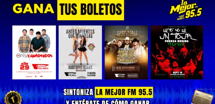 La Mejor FM 95.5 es la estación líder en Guadalajara, tenemos todos los boletos para ver a tus artistas favoritos. Sintoniza la 95.5 en tu radio, escucha las promociones exclusivas que tenemos y los programas de radio para tu entretenimiento.